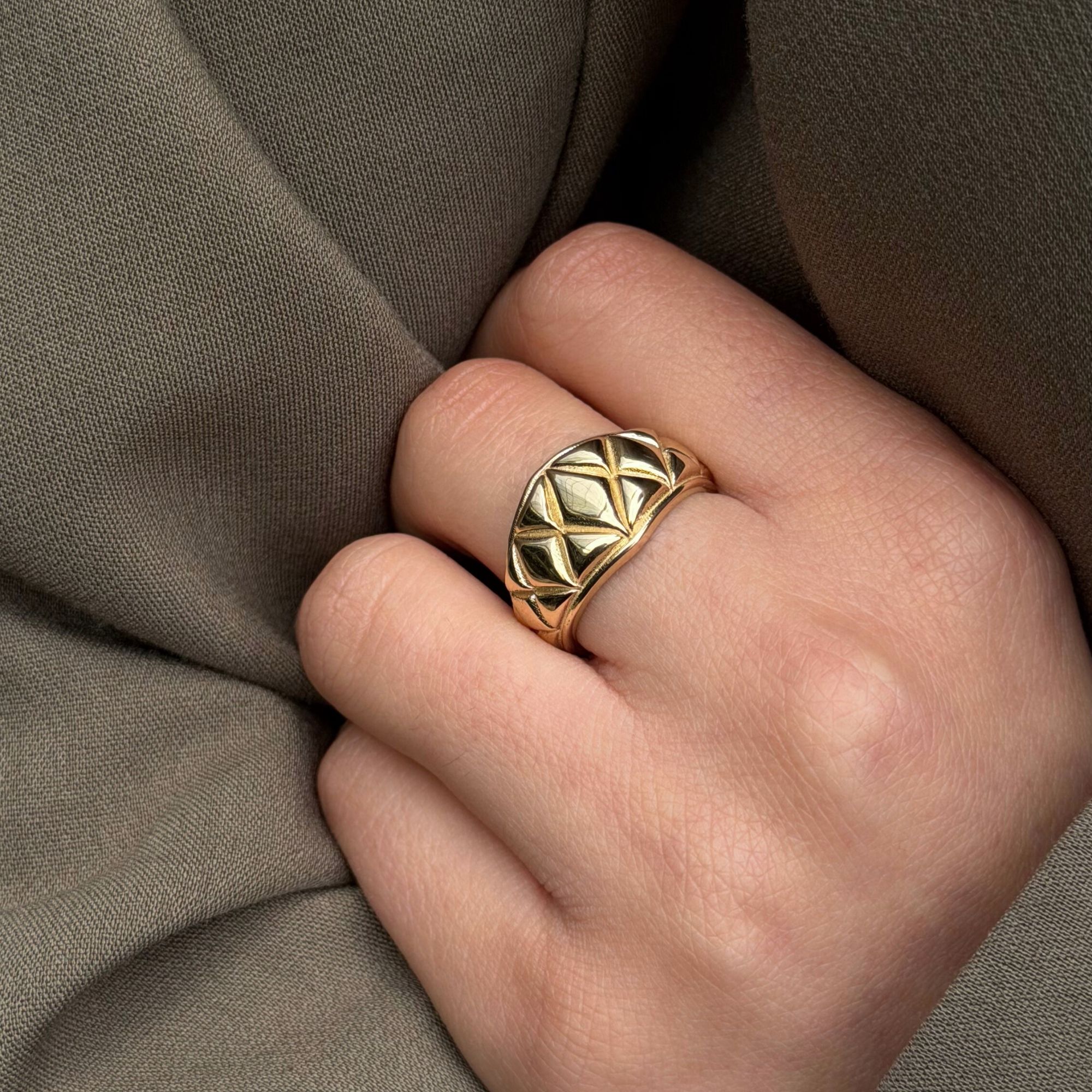 Geometrik Desen Taşlı Geniş Bant Altın Yüzük