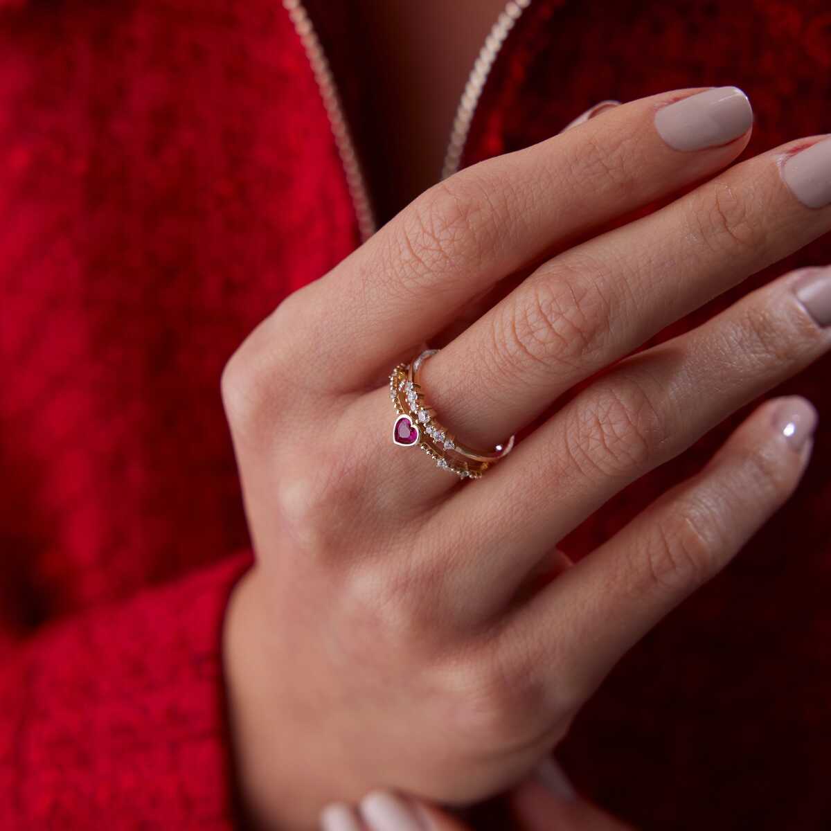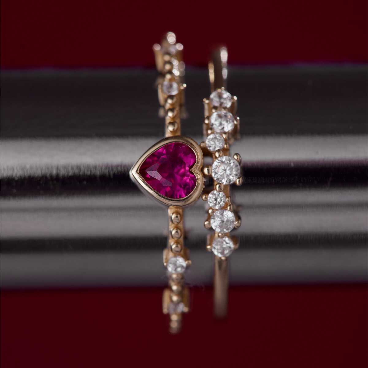 Kırmızı Taşlı Kalp İkili Yüzük