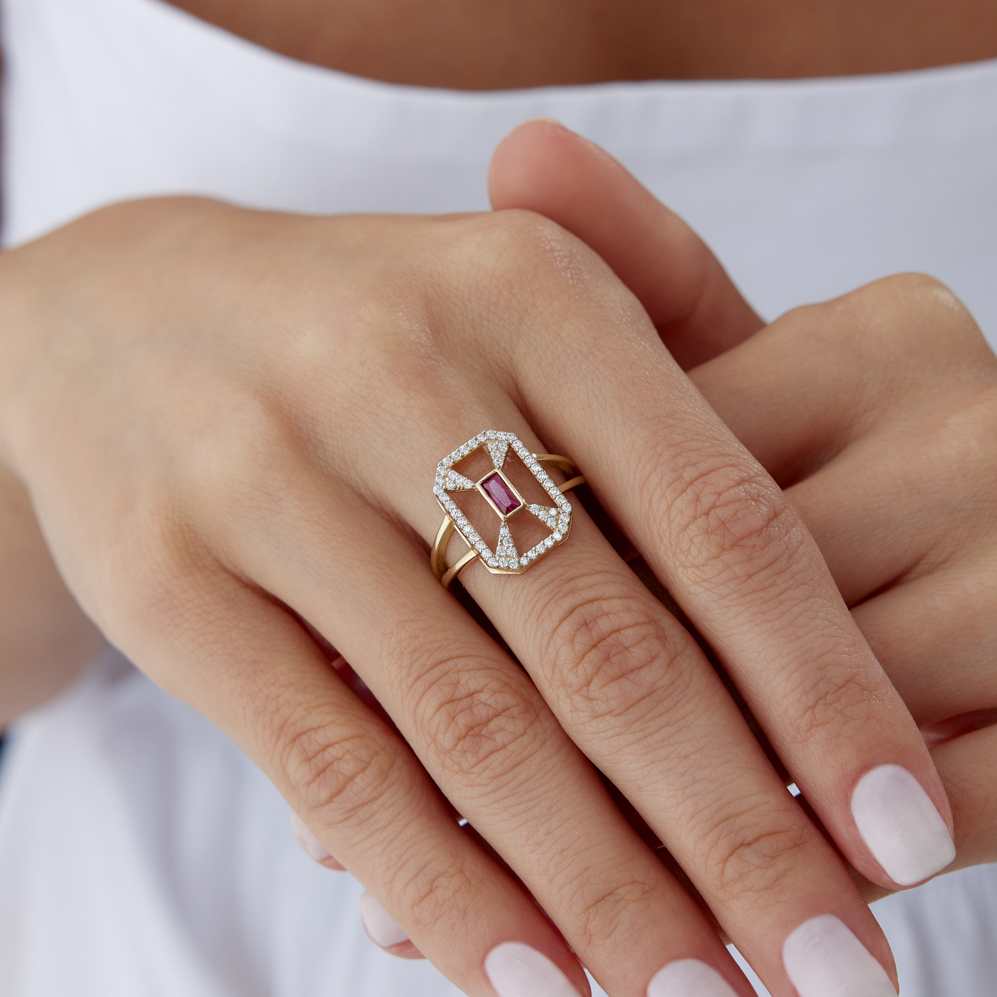 Oval Kırmızı Taşlı Geometrik Altın Yüzük - Cemart Oval Kırmızı Taşlı Geometrik Altın Yüzük - Cemart (1)